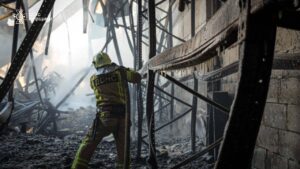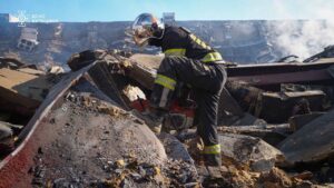 🗣Рятувальники метр за метром проливають залишки конструкцій будівлі, де ще подекуди триває горіння. Роботи значно ускладнює велика кількість зруйнованих металевих елементів — їх доводиться розрізати та розтягувати важкою інженерною технікою, аби дістатися до прихованих осередків пожежі.