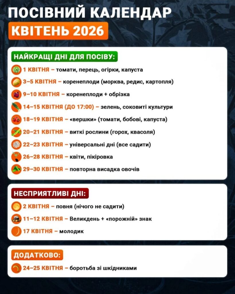 Тому вирішили розповісти про посівний календар на квітень 2026 року, заснований на фазах Місяця та астрологічних знаках, який підходить для всієї території України за київським часом.